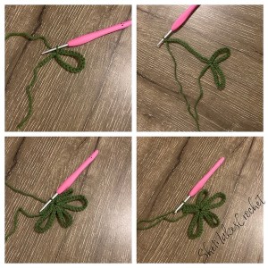 These pictures depict the process of making CH loops, SS joining to the same CH and finally working the 5 DC “stem” at the end.