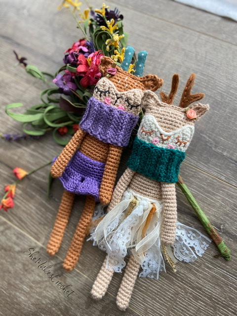 If you like this deer, be sure to check out my Bunny, Bear, Fox and Squirrel. They all compliment each other beautifully. So far, all of my rag dolls are worked in continuous rounds and I try to keep them as “No Sew” as possible, meaning the limbs and ears are worked in as you go. My other goal is to make a very simple doll, that gets elevated by optional details. I personally love adding non-crochet accents – think fabric and felt, but you could also do ribbon, buttons, beads, lace – just something extra to provide a touch of color and/or texture. I think those extra elements really pop against the simple look of the doll and these deer are no exception!