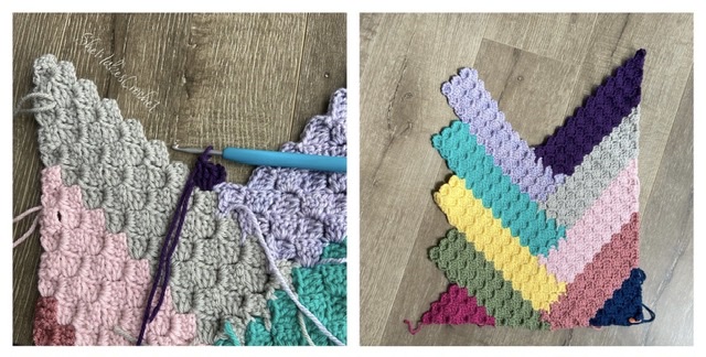 The first image depicts where to work the first c2c stitch (the wrong side is facing up). In the second image, the purple/right side block is complete and the panel has been turned so the right side is facing up.