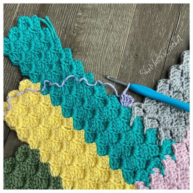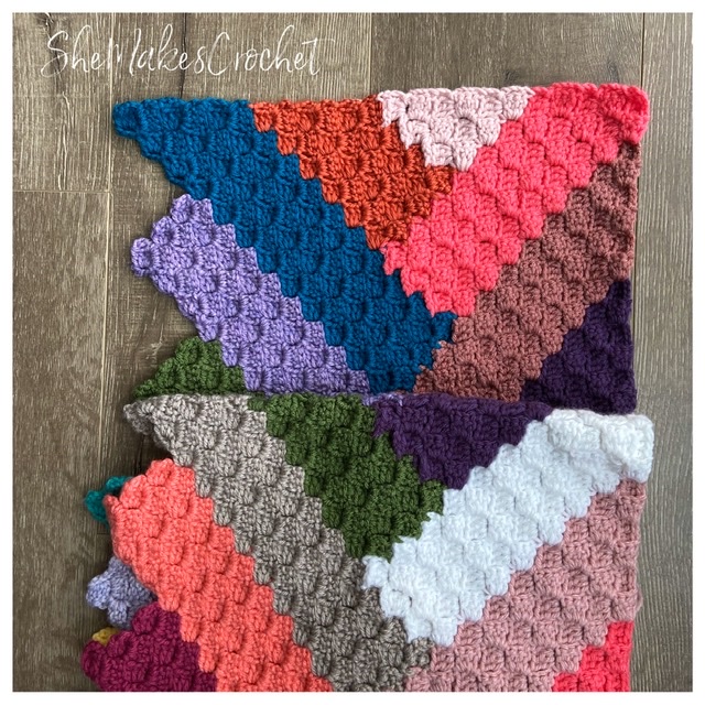 I hope you all had time to organize your scraps and review how to work a c2c stitch if you are unfamiliar with that. Also, if you haven’t already, please consider joining our Facebook group or ravelry group SheMakesCrochet Designs because I’m sure I speak for everyone when I say we’d love to see your progress pictures!