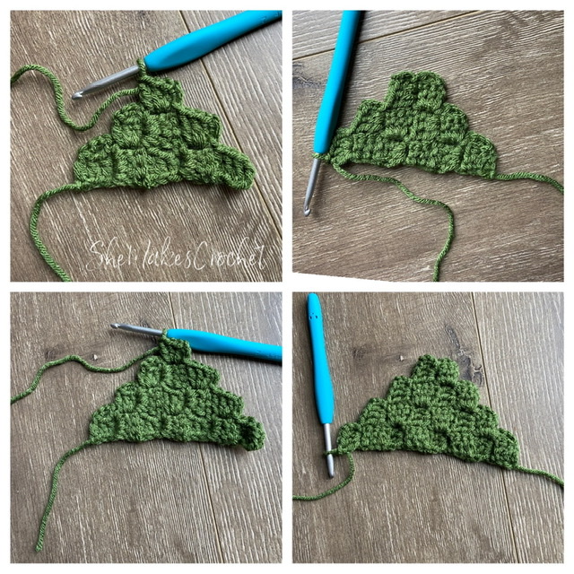 1. INC and work c2c stitches up the side for a total of 7 c2c stitches. (7)