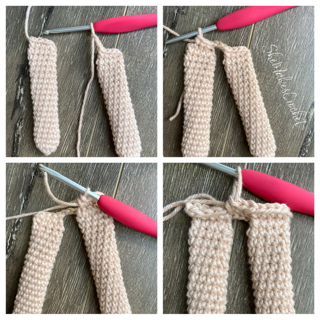 Image 4: further clarifies the 4 SC stitches you will complete and as you can see, after you work the blue, purple and pink stitches, there will be 1 stitch left unworked on the end.