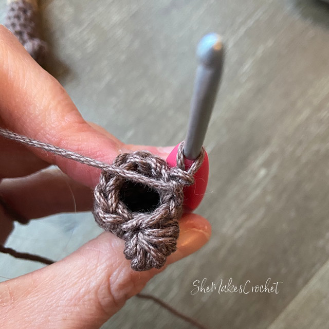 - Note: You should have a piece with 6 stitches total in the round – 3 “unworked stitches of Round 5” and 3 at the top of the flap created in Rounds 6-7.