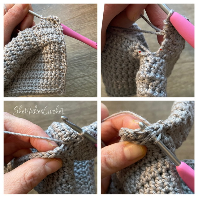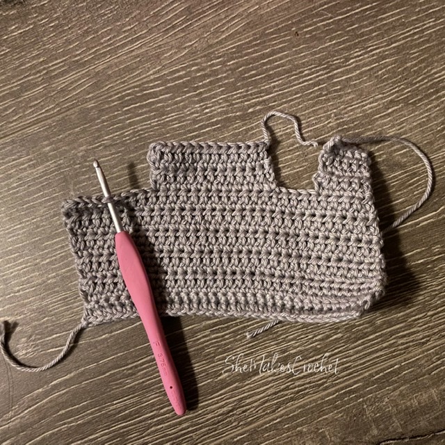 - Round 1: Insert hook into the second stitch from the back panel at the bottom of the sleeve. Draw up a loop, CH 1 and SC into the same space. SC into next stitch, work 4 SC up the side of the back panel, work 5 SC down the side of the front panel, SC into the final 2 stitches of the bottom. SS to join. (13 SC)