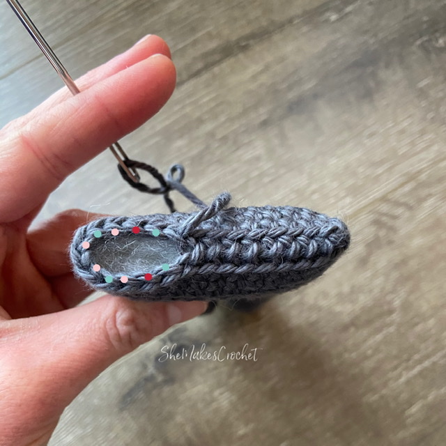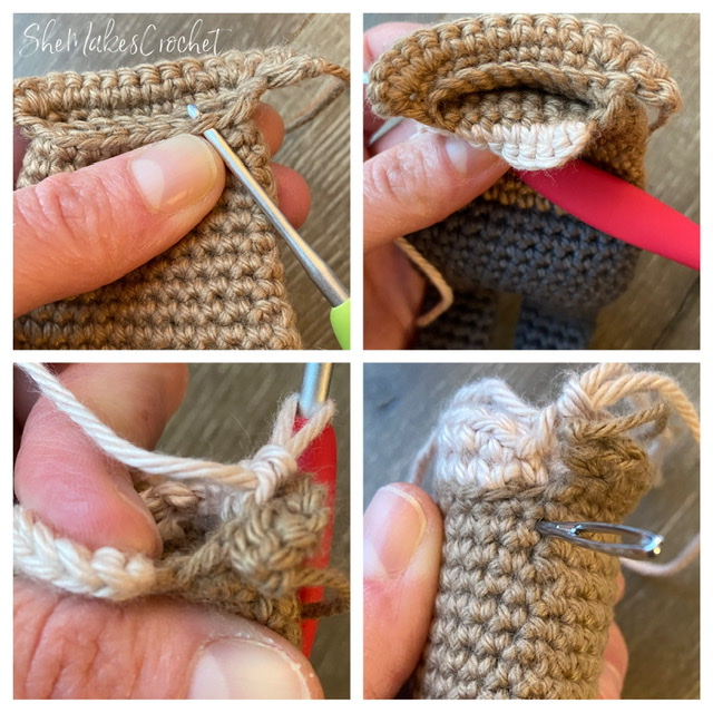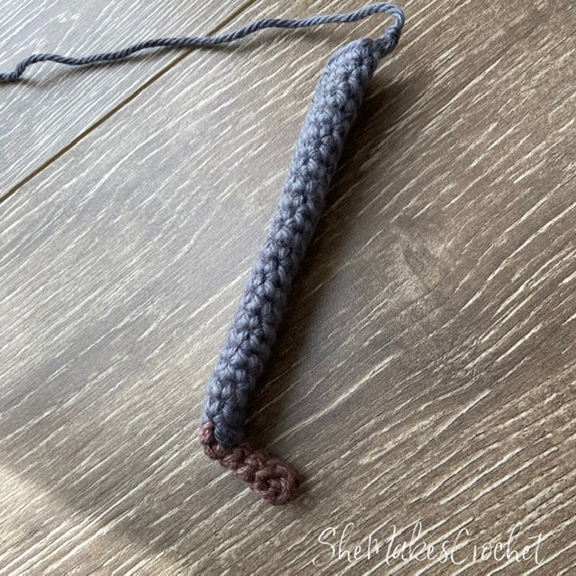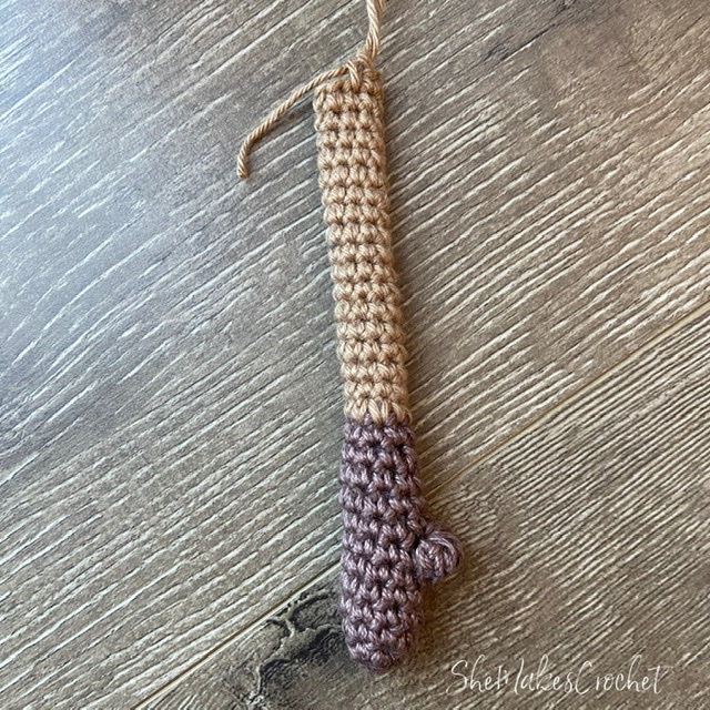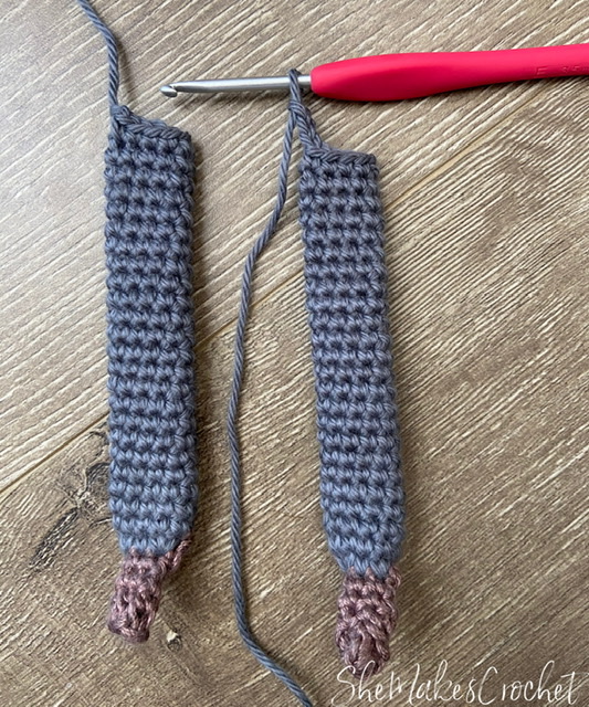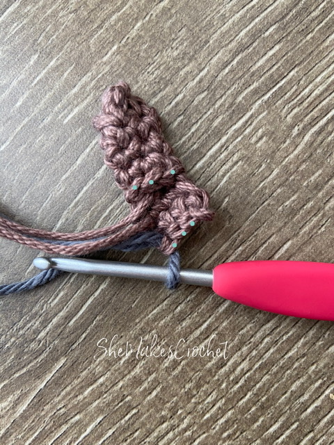- Round 7: CH 1 and turn. SC in first 3 stitches, switching to pant color on the last yarn over of the last stitch.