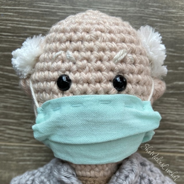 I love his little surgical mask and how it fits up under his glasses, his little “grumpy” eyebrows and yet his sweet looking face and of course his mittens. Probably the best part is that he is posable. If you didn’t notice at the start of this post, he can sit unsupported. He can cross his arms and legs, he can be stretched out flat, he can hold his little envelope of important documents. He’s one of my favorite makes and I hope you love making him too!