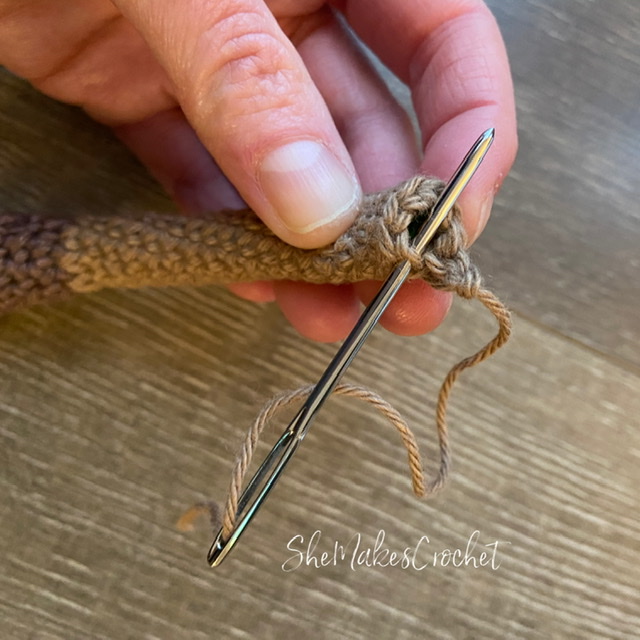- Thread the tail of one of the arms into a darning needle. Weave the needle back and forth through the back loops of the last round of stitches and then pull tight to close off the opening. Repeat this process for the second arm. Be sure to leave the long tails! Place the arms aside.