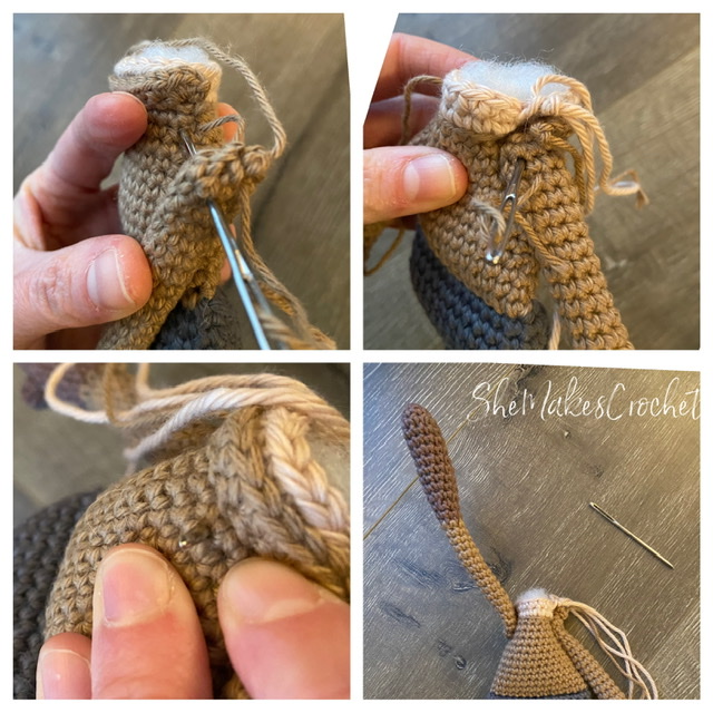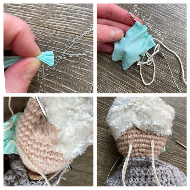 Take a piece of yarn and thread it through the folded over hem on the short edge to loop around the ears. I pierced my yarn into a stitch behind the ear and then out the back the of the head. Work both ends out the same stitch in the back of the head and then tie together and burry inside the head.