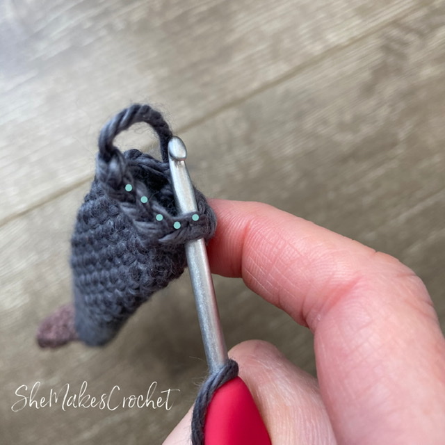 - Round 4: CH 1, turn. SC, INC, SC 3, DEC, DEC, SC 3, INC. SS to join. (13 SC)