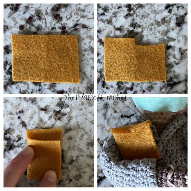 I used a small 3 inch by 2 inch scrap of felt. Cut a small notch out of one half of the long rectangle as pictured. Fold in half and stitch around the 3 sides. Alternatively, you could use some small daps of glue. Fold the top flap down and tack in place with your preferred method, I made several small stitches.