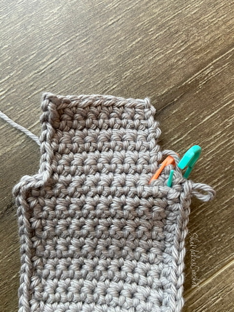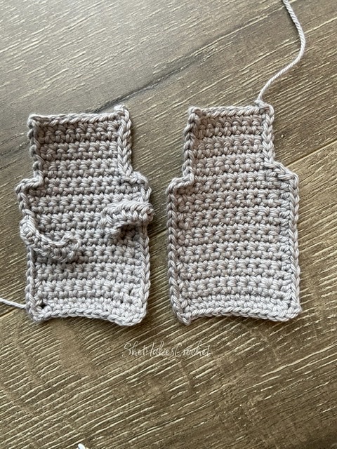 The panels are worked in one continuous piece meaning there is no cutting or attaching yarn! After working a basic rectangle and the head, the final “Row” will be to crochet around the perimeter and that’s when the arms get worked.