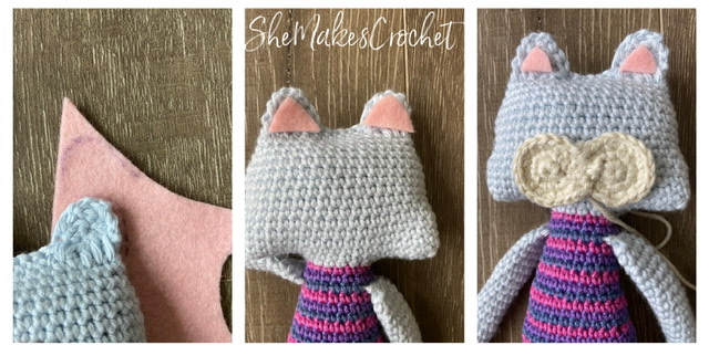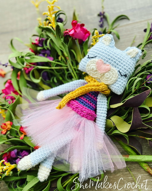 Back to this sweet cat! As with my other rag dolls in this collection, they are worked in continuous rounds and I try to keep them as “No Sew” as possible, meaning the limbs, tail and ears are worked in as you go. My other goal is to make a very simple doll, that gets elevated by optional details. I personally love adding non-crochet accents – think fabric and felt, but you could also do ribbon, buttons, beads, lace – just something extra to provide a touch of color and/or texture. For these cats I chose to do a little colorwork and a fun tutu. EEk! Aren’t they adorable?