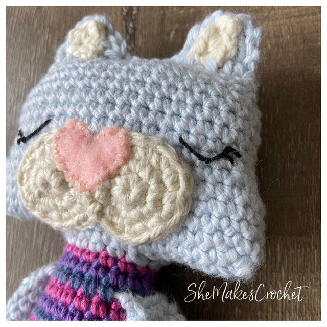 I crocheted a little heart. (The heart pattern from my candygrams works perfectly! The pattern for the heart is at the bottom of the post.) I stitched into onto the face upside down.