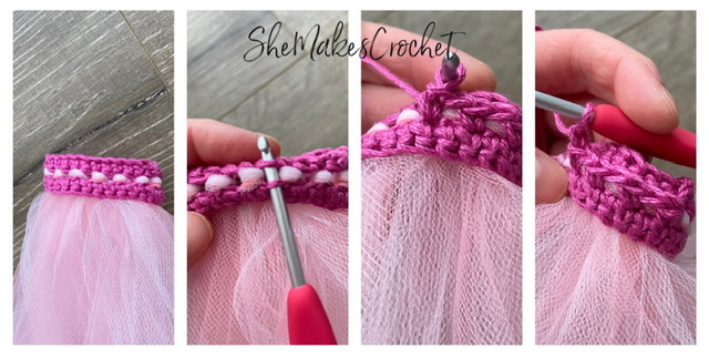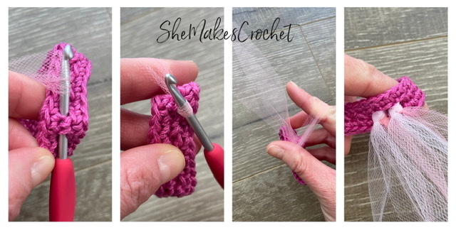 Attach the tulle to the waist band by folding a long strip in half and looping it around the SC stitches of Row 2 (they are separated by CH spaces) as shown in the images above. Basically, you will use a crochet hook to draw up a loop of tulle and then pull the two tails of tulle through the loop. Attach 2 strips of tulle to each SC stitch. I had 2 different shades of pink/blue and used 1 of each.