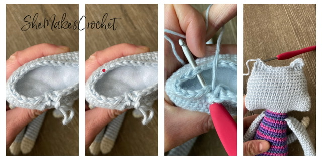 Now we will attach the legs and start working the body. If you prefer, you may continue to use the cat color for the body. I decided to make colorful stripes. If you would like to achieve this look, cut your yarn and pull out your last stitch. Complete the final yarn over of the last stitch using your new color. See the images below: