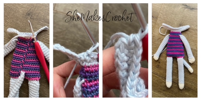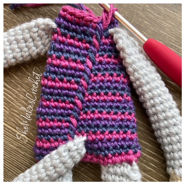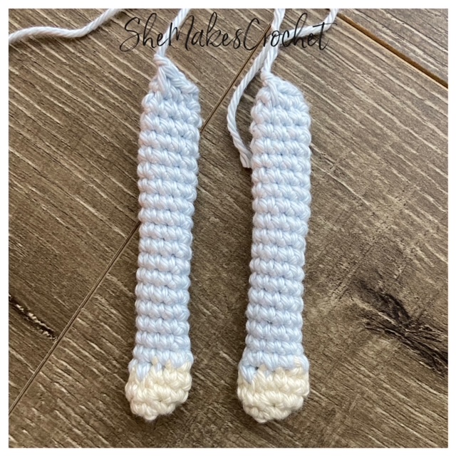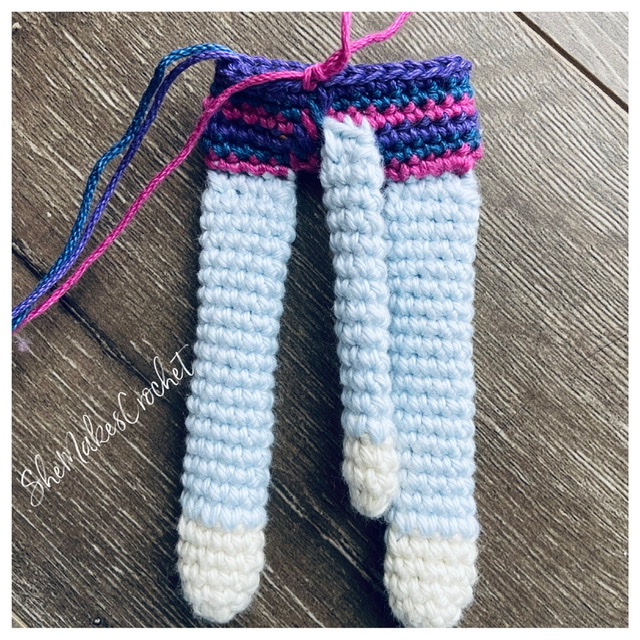 - Break the yarn and complete a second leg. DO NOT fasten off after the second leg. Instead, continue on to the body below.