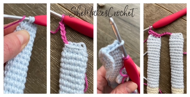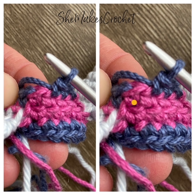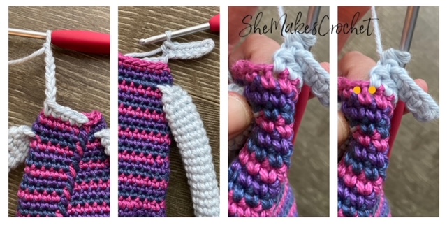 Image 4: further clarifies the 4 SC stitches you will complete and as you can see, after you work the blue, purple and pink stitches, there will be 1 stitch left unworked on the end.