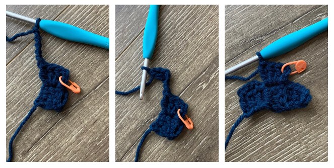 We want to increase the stitch count for this row from 1 to 2 and so we must work an increase.  CH 6 and work a DC into the 4th, 5th and 6th CH from the hook.  (An increase has been made).  SS into the CH 3 loop of the marked stitch and work the remaining stitch of the row by CH 3 and DC 3 times into the CH 3 loop (the one with the stitch marker).  Remove the stitch marker and place it into the CH 3 loop you just made when working this last stitch.