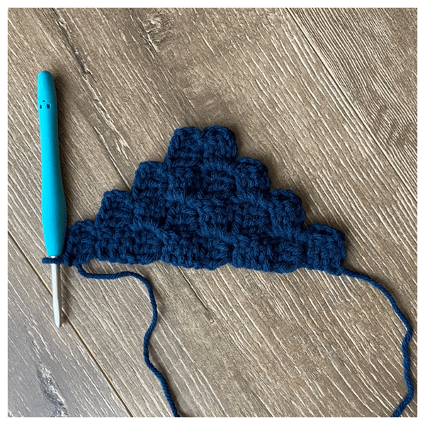 CH 3 and SS into the CH 3 loop of the previous stitch – the C2C stitch you just made.  Now work the 10 stitches of the row.  Fasten off.
