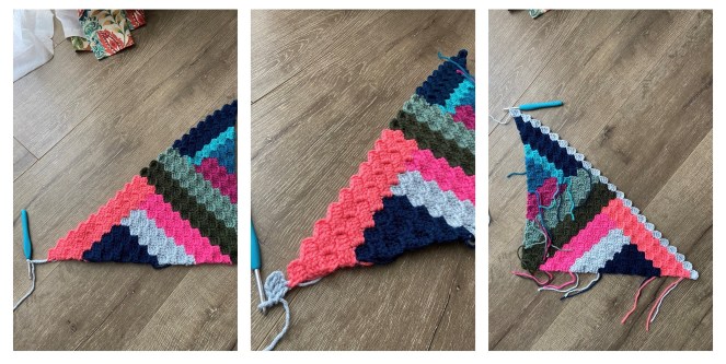 *As with before, a chain 3 loop needs to be created before fastening off so that we can work on top of this last stitch. So work one last decrease by making a CH 3 and SS into the previous stitch – the C2C stitch you just made.*