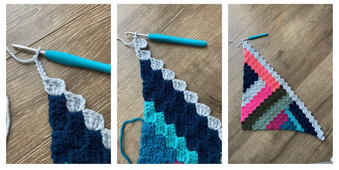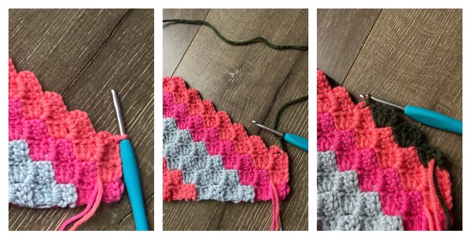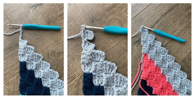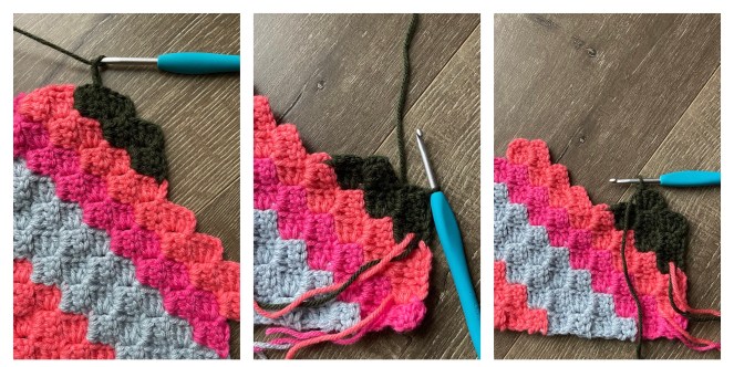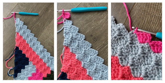 DEC or in other words, CH 3 and SS into the CH 3 loop of the previous stitch – the C2C stitch you just made. Fasten off. Attach new color in the same spot. Then continue and work the 3 stitches of the row starting with CH 3 and 3 DC. SS to the adjacent stitch.