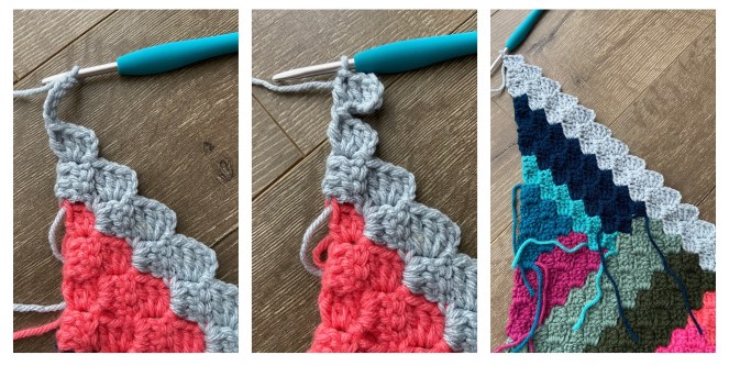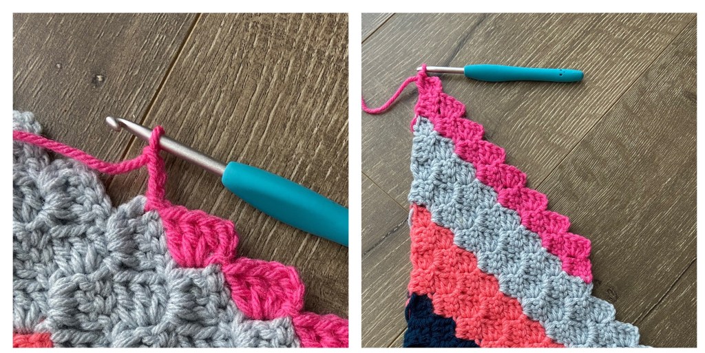 DEC, or in other words, CH 3 and SS into the CH 3 loop of the previous stitch – the C2C stitch you just made. Fasten off. Attach new color in same spot. Then continue and work the 8 stitches of the row.