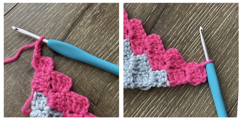 CH 3 and SS into the CH 3 loop of the previous stitch – the C2C stitch you just made. Now work the 2 stitches of the row.
